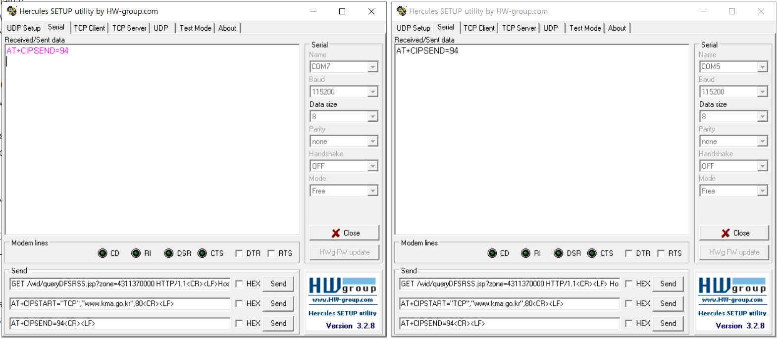 COM7 에서 UART3에 Transmit -> COM5 Uart2에 Receive